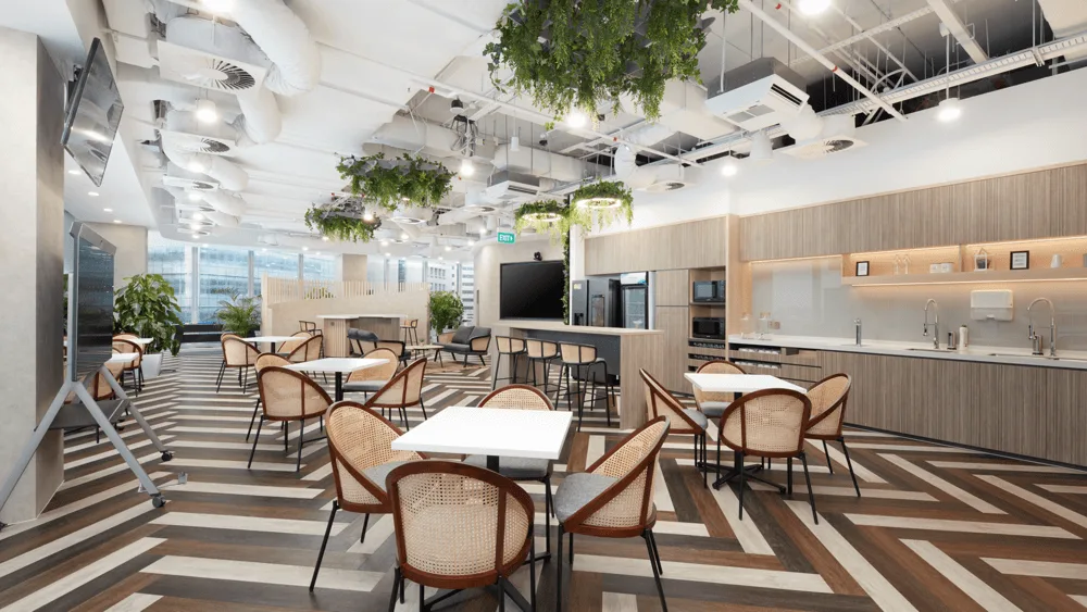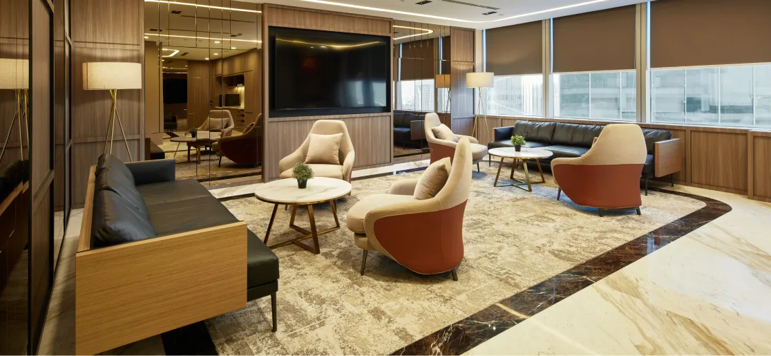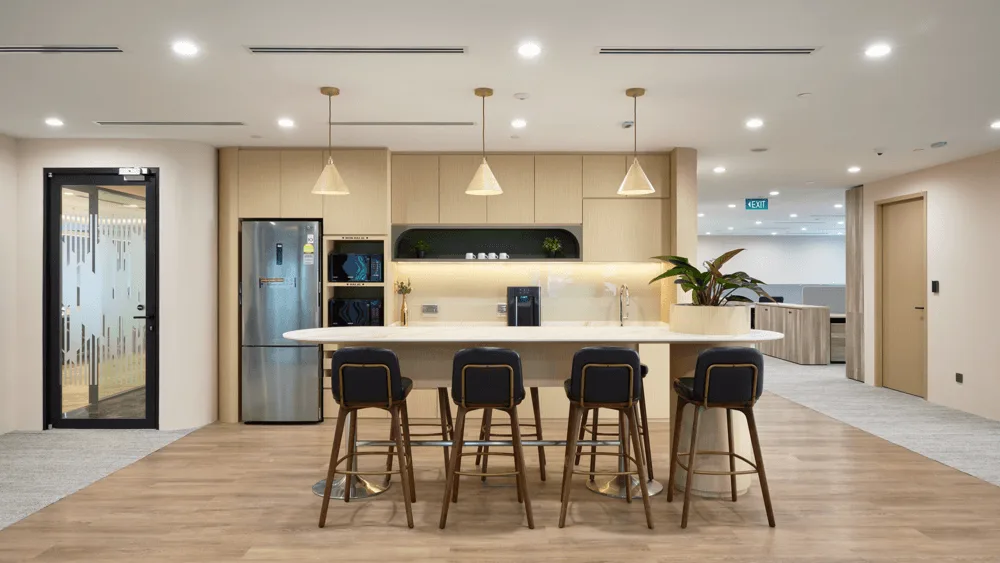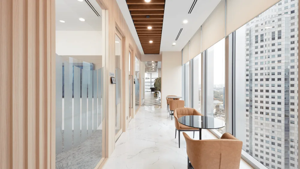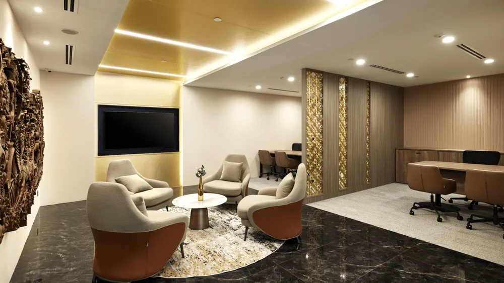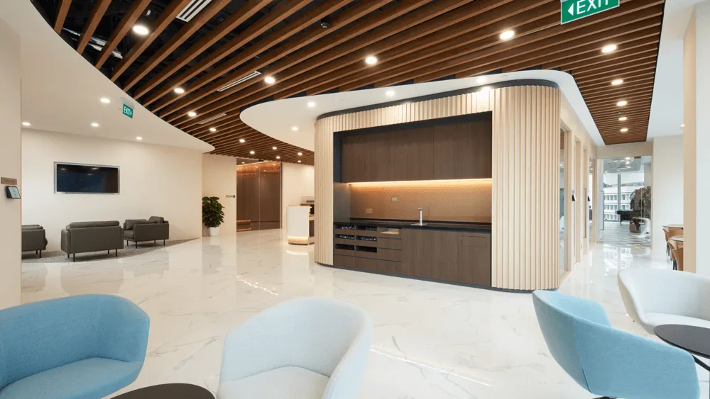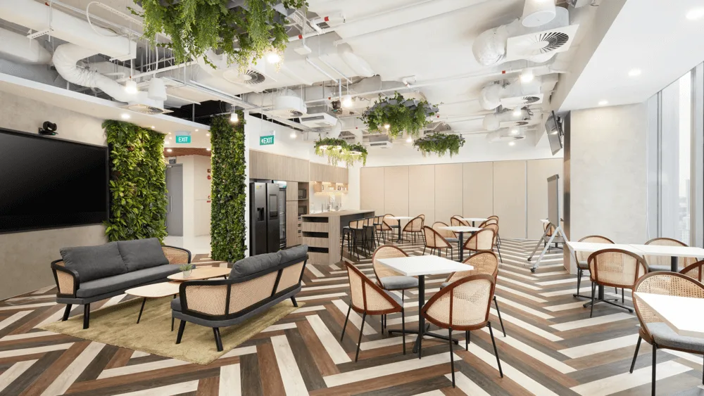 adm Design & Build enhanced BNI Singapore’s new office at 30 Raffles Place with a nature-inspired design concept incorporating luxurious elements, diverse workspaces, and employee wellness features.