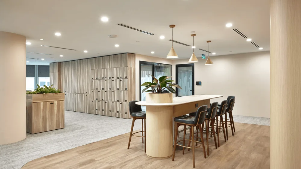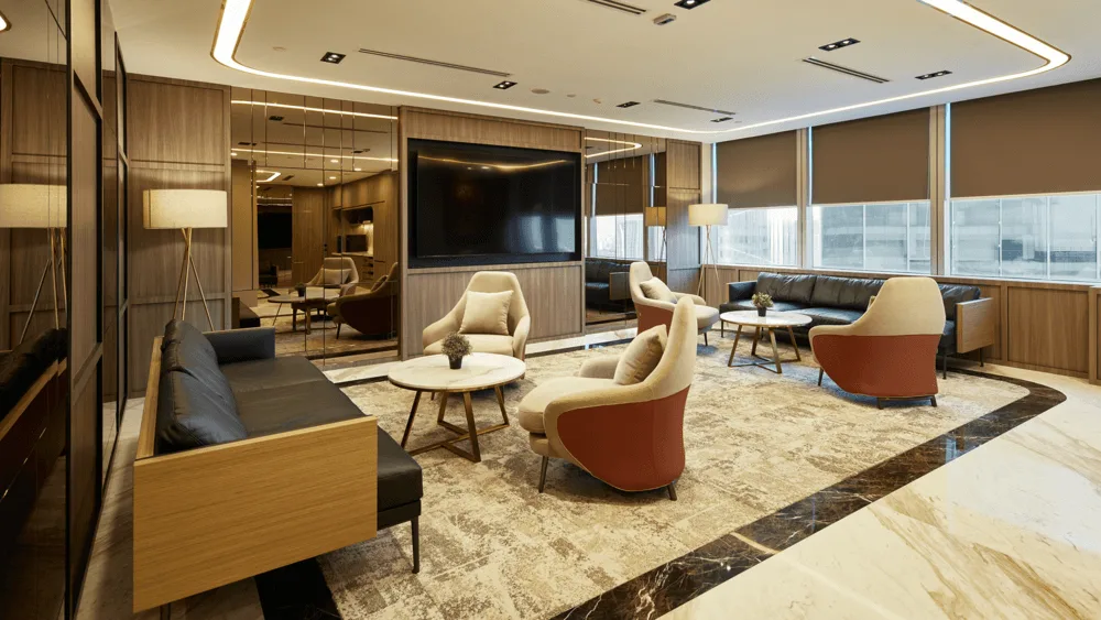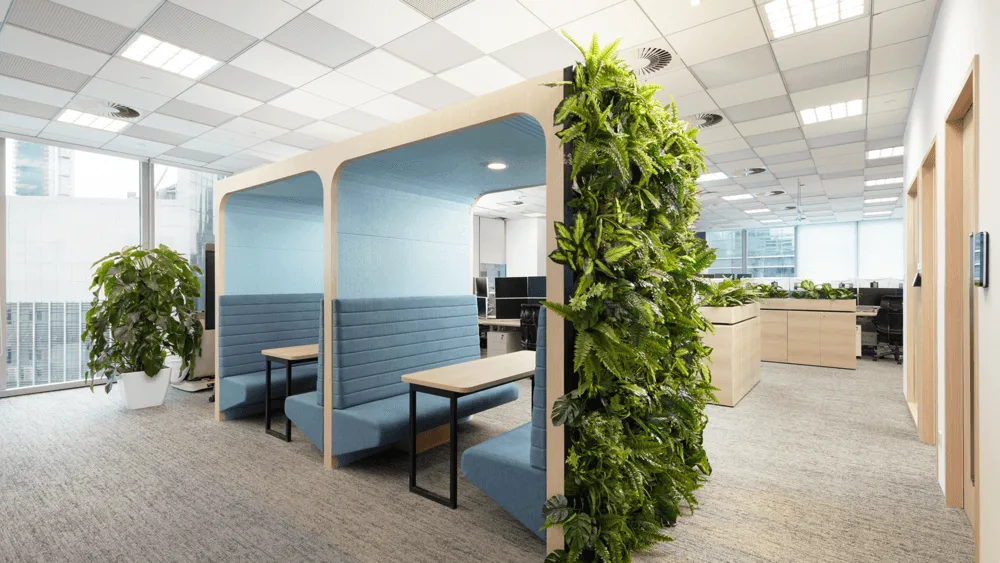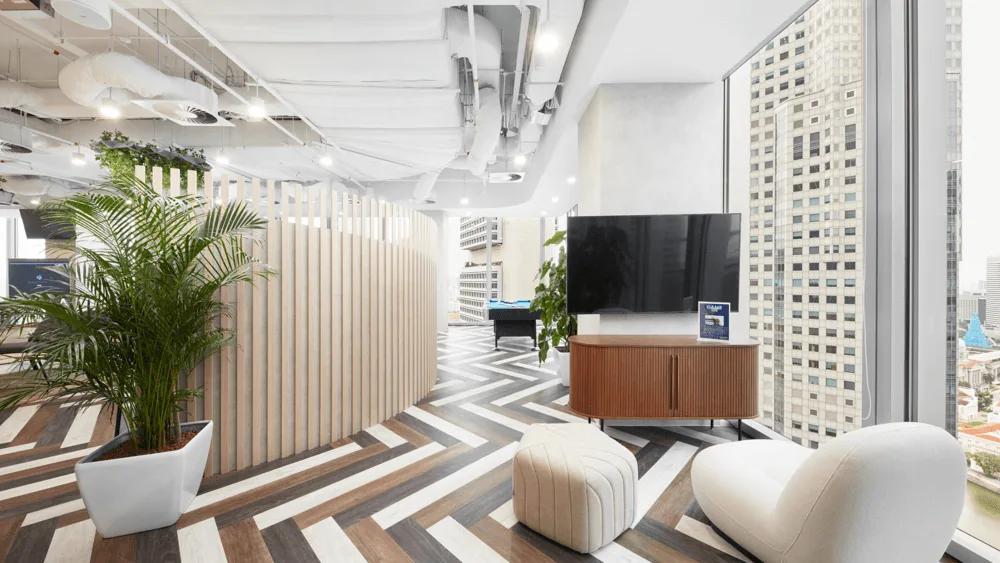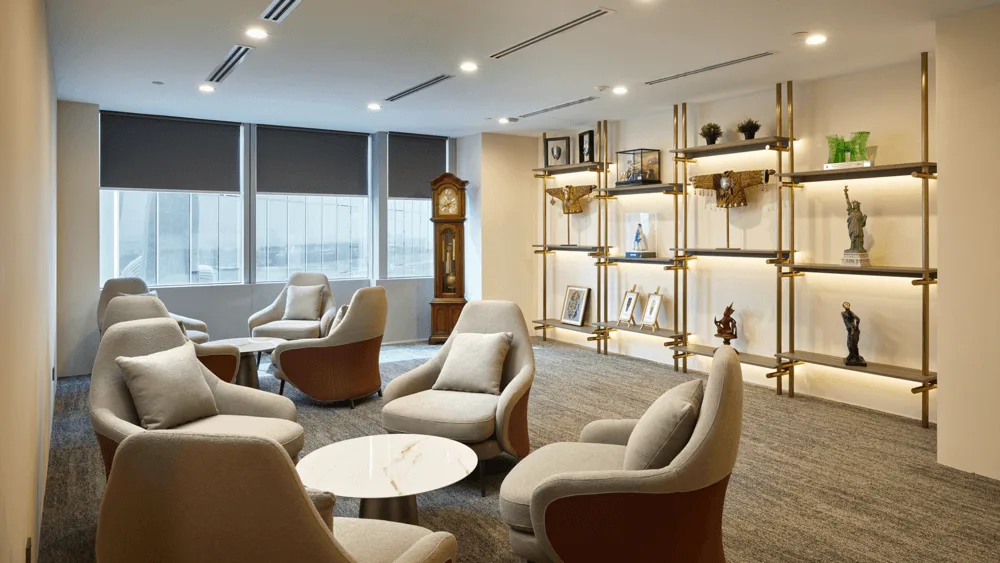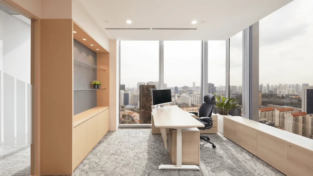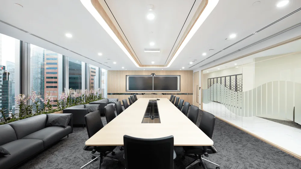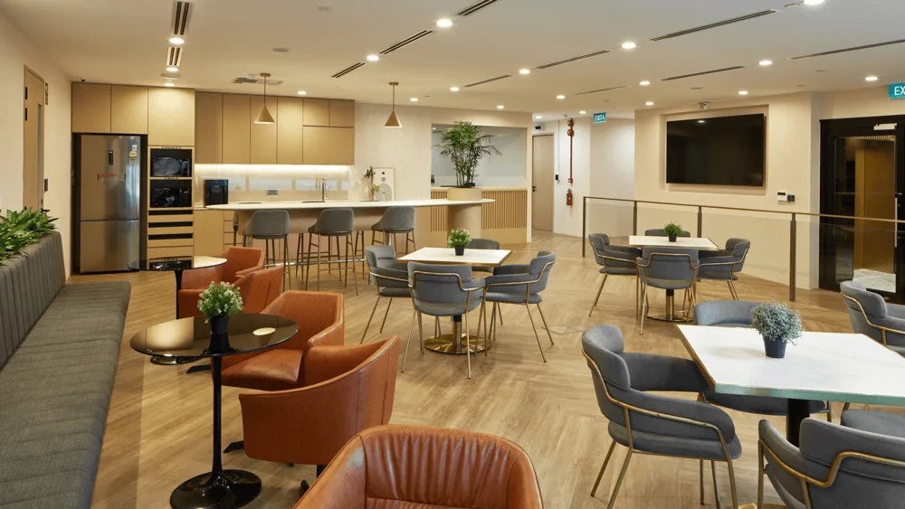 adm Design & Build enhanced BNI Singapore’s new office at 30 Raffles Place with a nature-inspired design concept incorporating luxurious elements, diverse workspaces, and employee wellness features.