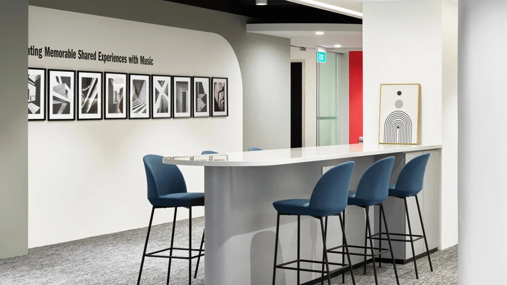 The large pantry and breakout space allow employees, admin crew, programmers and musicians to connect, interact or even, take a respite from work. Modular furniture in place for town halls, networking events, collaboration spaces, or discussion spots, where curvy and smooth lines are the main melodies in this space, offering bold and vibrant vibes to the space.