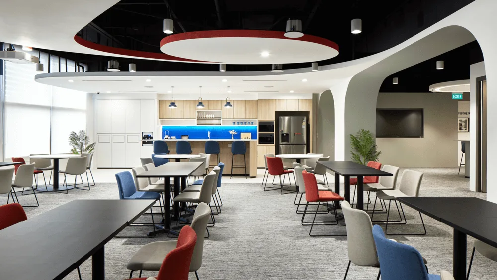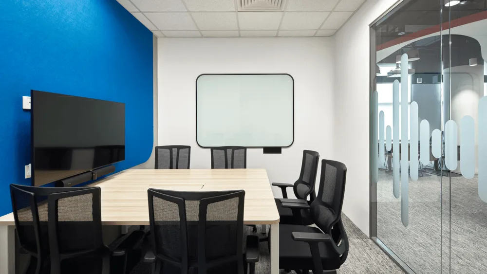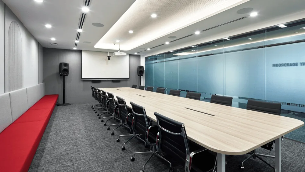 The office is designed in an open concept with multiple seating options and acoustic panels rhythmically positioned at the ceiling in vibrant red, serenity blue, and neutral grey colours. Meeting rooms are equipped with acoustic panels and writing panels with frosted stickers on the double-glazing glass.