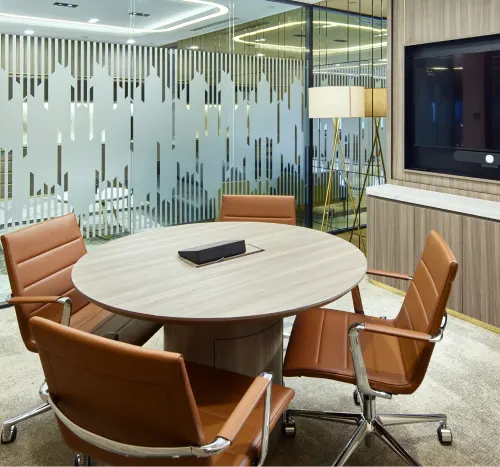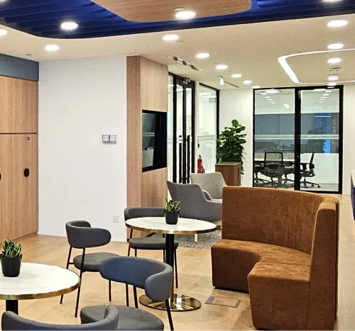 The office is designed in an open concept with multiple seating options and acoustic panels rhythmically positioned at the ceiling in vibrant red, serenity blue, and neutral grey colours. Meeting rooms are equipped with acoustic panels and writing panels with frosted stickers on the double-glazing glass.