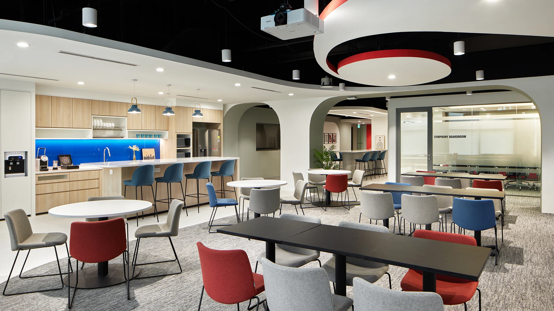 The large pantry and breakout space allow employees, admin crew, programmers and musicians to connect, interact or even, take a respite from work. Modular furniture in place for town halls, networking events, collaboration spaces, or discussion spots, where curvy and smooth lines are the main melodies in this space, offering bold and vibrant vibes to the space.