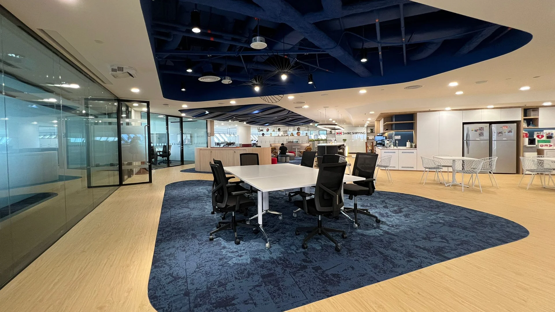 The office is designed in an open concept with multiple seating options and acoustic panels rhythmically positioned at the ceiling in vibrant red, serenity blue, and neutral grey colours. Meeting rooms are equipped with acoustic panels and writing panels with frosted stickers on the double-glazing glass.